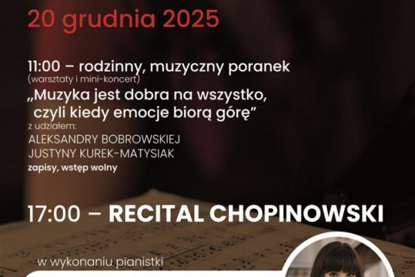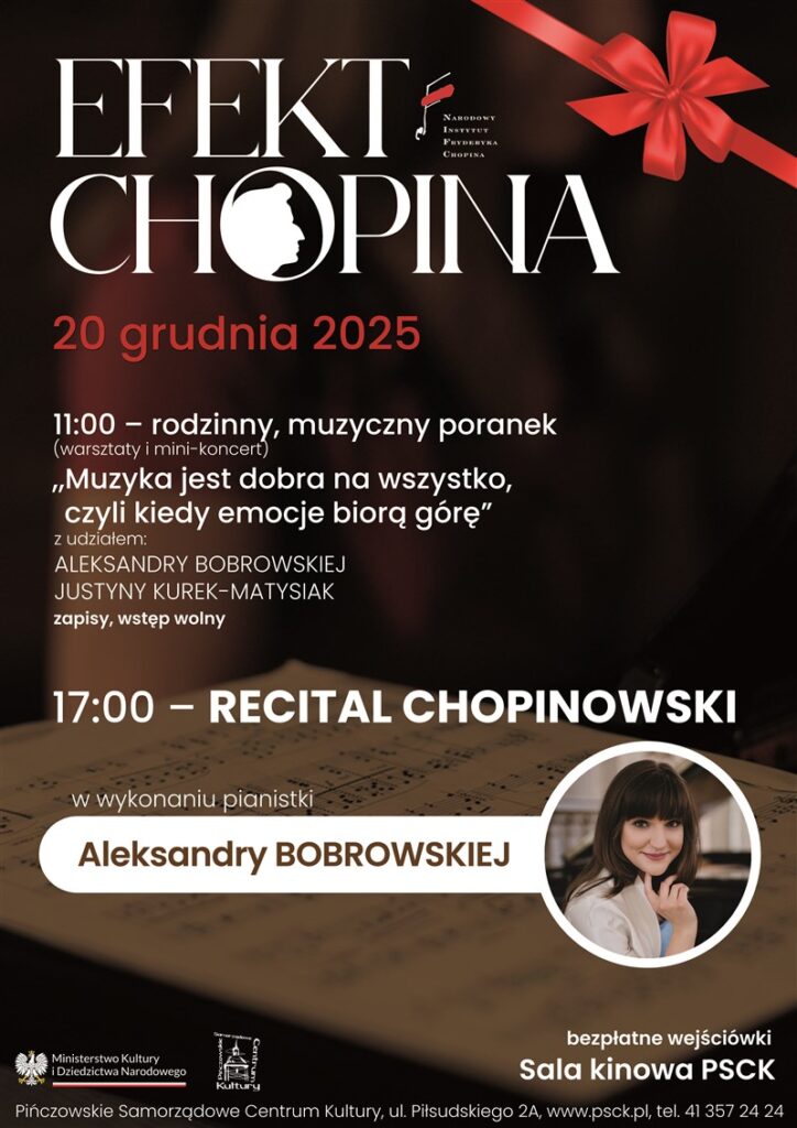 Koncert „Efekt Chopina” odbędzie się w sobotę, 20 grudnia, o godzinie 17 w Pińczowskim Samorządowym Centrum Kultury. Repertuar recitalu stanowić będzie przekrojową podróż przez różnorodne formy i style obecne w twórczości Chopina. Wstęp jest bezpłatny, ale obowiązują wejściówki, które można odebrać w sekretariacie PSCK.