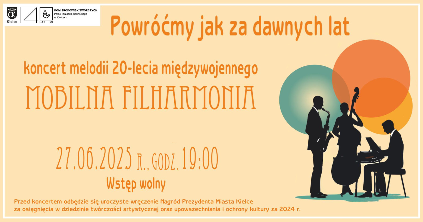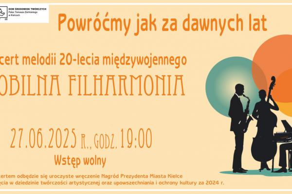 Podczas koncertu uczestnicy będą mogli przenieść się do epoki, kiedy świat tańczył w blasku lamp gazowych, a na scenach królowały nieśmiertelne przeboje Eugeniusza Bodo, Mieczysława Fogga, Hanki Ordonówny i wielu innych legend polskiej piosenki. W wyjątkowych aranżacjach, wykonanych na żywo przez artystów Mobilnej Filharmonii, zabrzmią dźwięki, które przed laty rozbrzmiewały w najlepszych kabaretach i salonach.