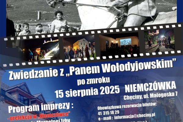 Organizatorzy zapraszają wszystkich pasjonatów historii, historii regionu i miłośników kina na Zwiedzanie z panem Wołodyjowskim po zmroku, które na stałe już wpisało się w krajobraz kulturalny Chęcin. Wydarzenie rozpoczyna się w zabytkowej kamienicy Niemczówka, a kończy na Zamku Królewskim.