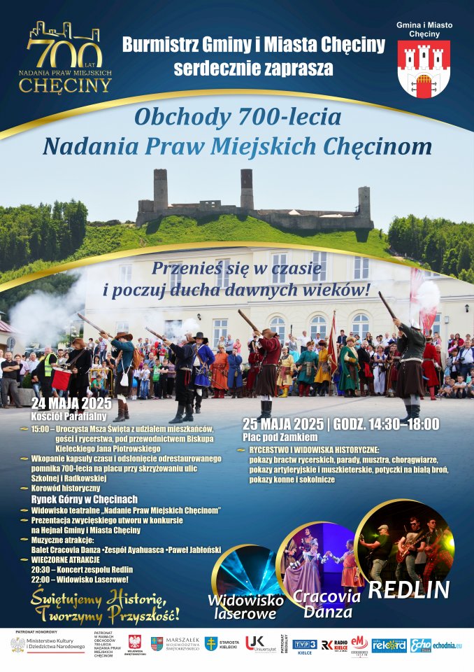 Świętowanie rozpocznie się w sobotę, 24 maja, o godzinie 15, od uroczystej Mszy Świętej pod przewodnictwem biskupa kieleckiego Jana Piotrowskiego w kościele parafialnym w Chęcinach. Następnie odbędzie się wkopanie kapsuły czasu oraz odsłonięcie odrestaurowanego pomnika 700-lecia na placu przy skrzyżowaniu ulic Szkolnej i Radkowskiej. Na uczestników czeka także barwny korowód historyczny, który przejdzie ulicami miasta.