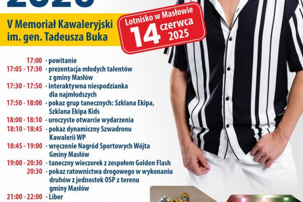 Nie zabraknie widowiskowych pokazów: Szwadronu Kawalerii Wojska Polskiego w ramach V Memoriału Kawaleryjskiego im. gen. Tadeusza Buka oraz ratownictwa drogowego, który zaprezentują druhowie OSP z terenu gminy Masłów.