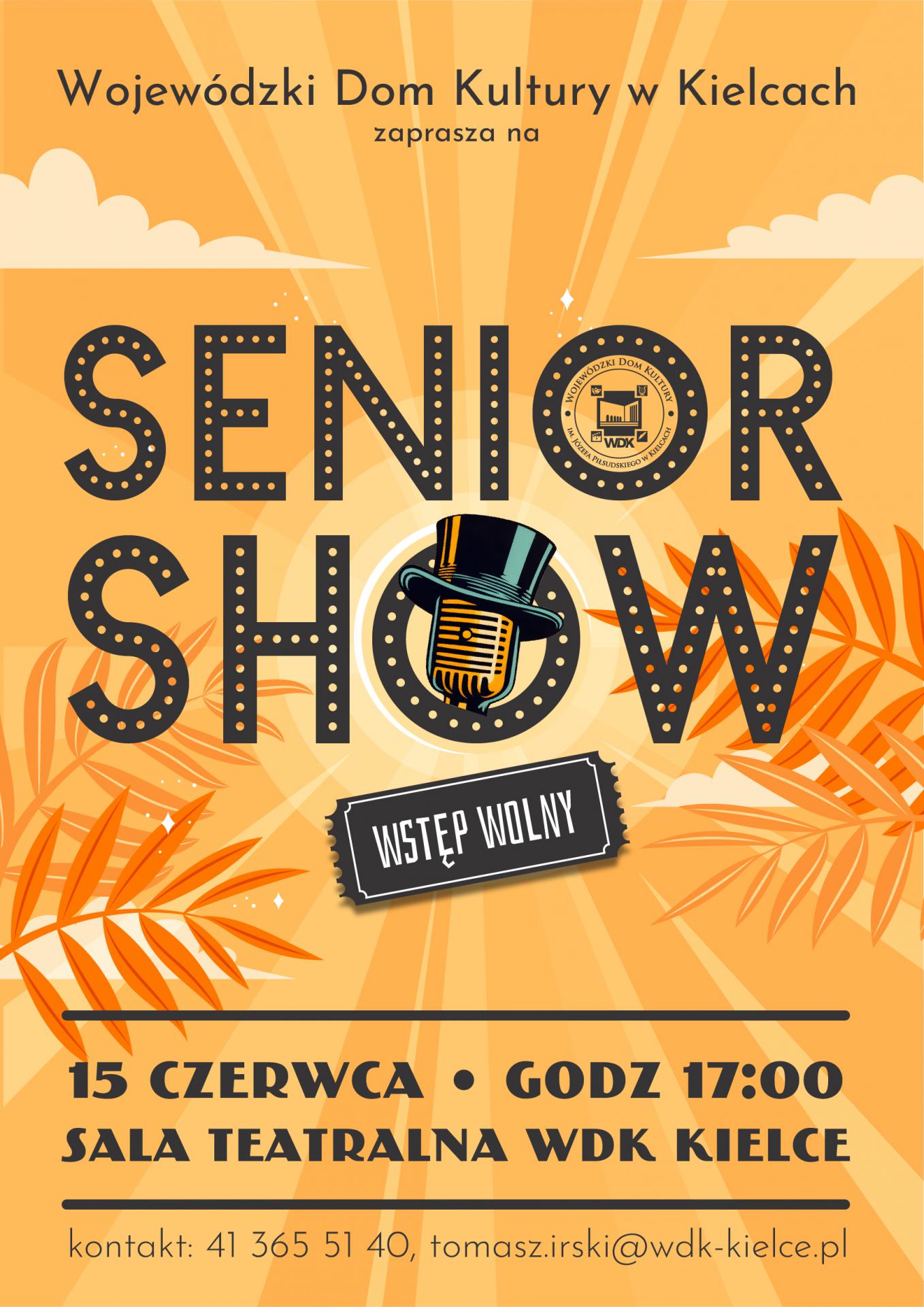 To będzie kolejny ciekawy wieczór pełen emocji i niespodzianek. Będą występy wokalne, taneczne, recytatorskie i wiele innych. Senior Show odbędzie się 15 czerwca o godzinie 17 w sali teatralnej Wojewódzkiego Domu Kultury im. Józefa Piłsudskiego w Kielcach. Wstęp jest bezpłatny.