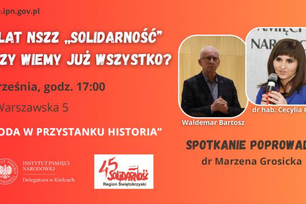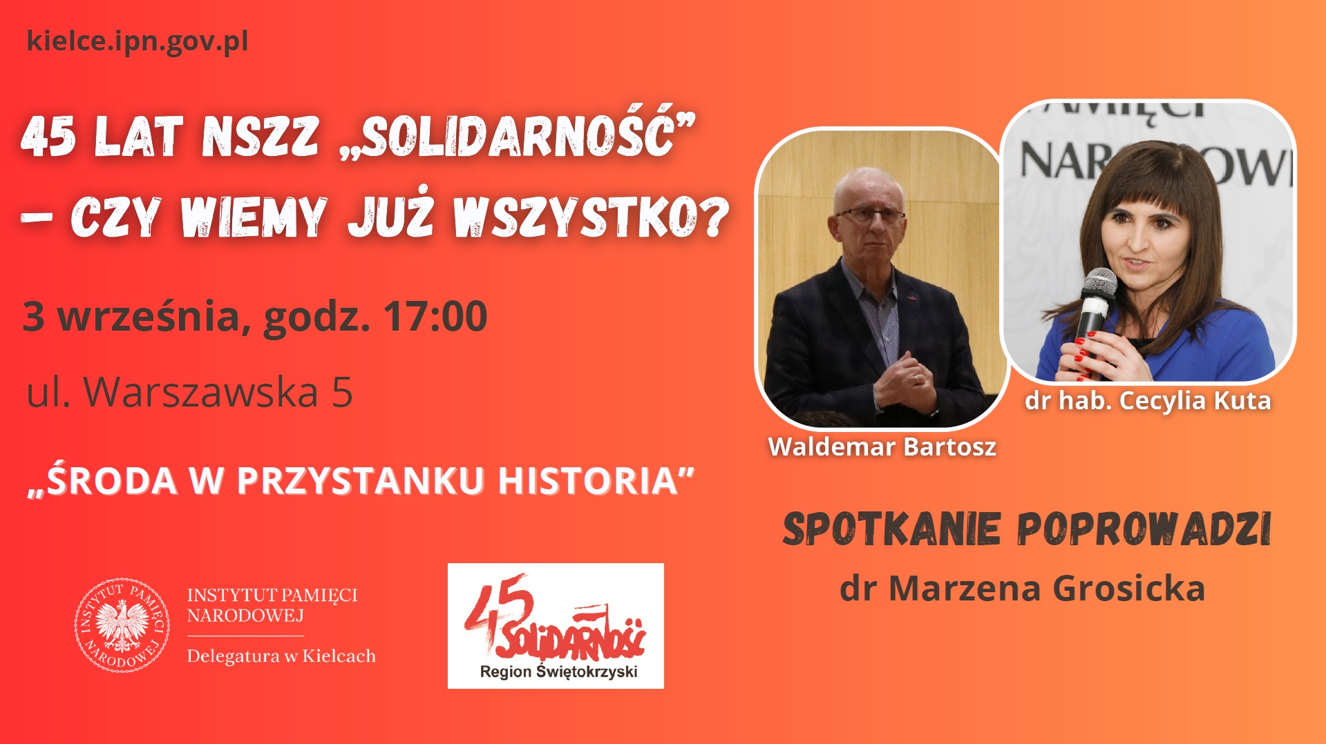 Gośćmi spotkania będą Waldemar Bartosz, przewodniczący Regionu Świętokrzyskiego NSZZ „Solidarność” oraz dr hab. Cecylia Kuta, naczelnik Oddziałowego Biura Badań Historycznych IPN w Krakowie. Dyskusję poprowadzi dr Marzena Grosicka, kierownik Referatu Badań Historycznych w Delegaturze IPN w Kielcach.