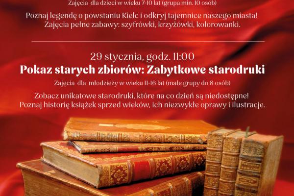 Pokaz starych zbiorów: zabytkowe starodruki (29 stycznia) to zajęcia, które umożliwią przestudiowanie unikatowych starodruków, które na co dzień są niedostępne dla zwiedzających. Dzieci i młodzież poznają historię książek sprzed wieków, obejrzą ich niezwykłe oprawy i ilustracje.
