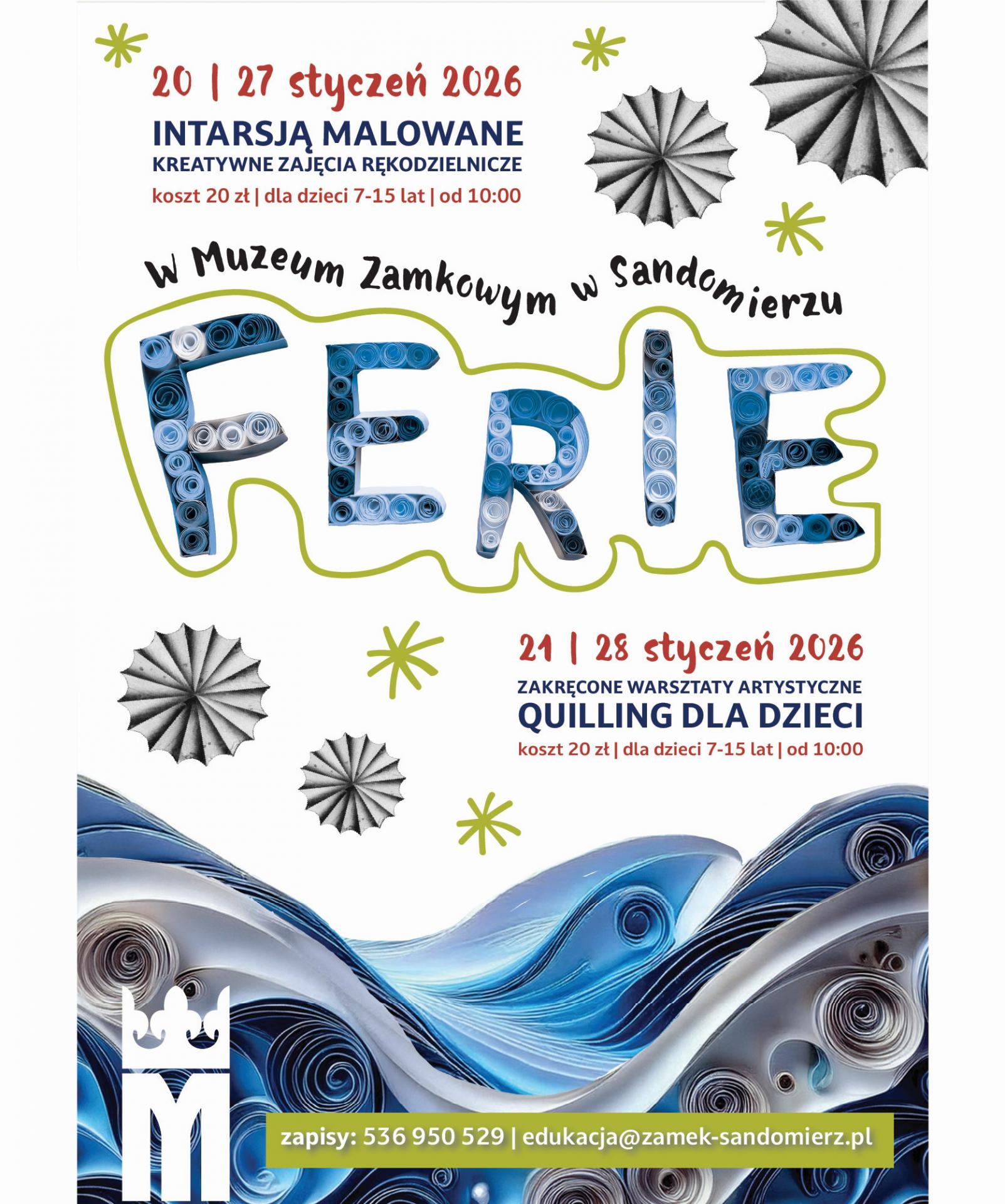 Na zajęcia odbywające się w ramach Ferii zimowych 2026 w Muzeum Zamkowym w Sandomierzu należy zapisywać się telefonicznie: 536 950 529 lub mailowo: edukacja@zamek-sandomierz.pl, gdyż ilość miejsc jest ograniczona.