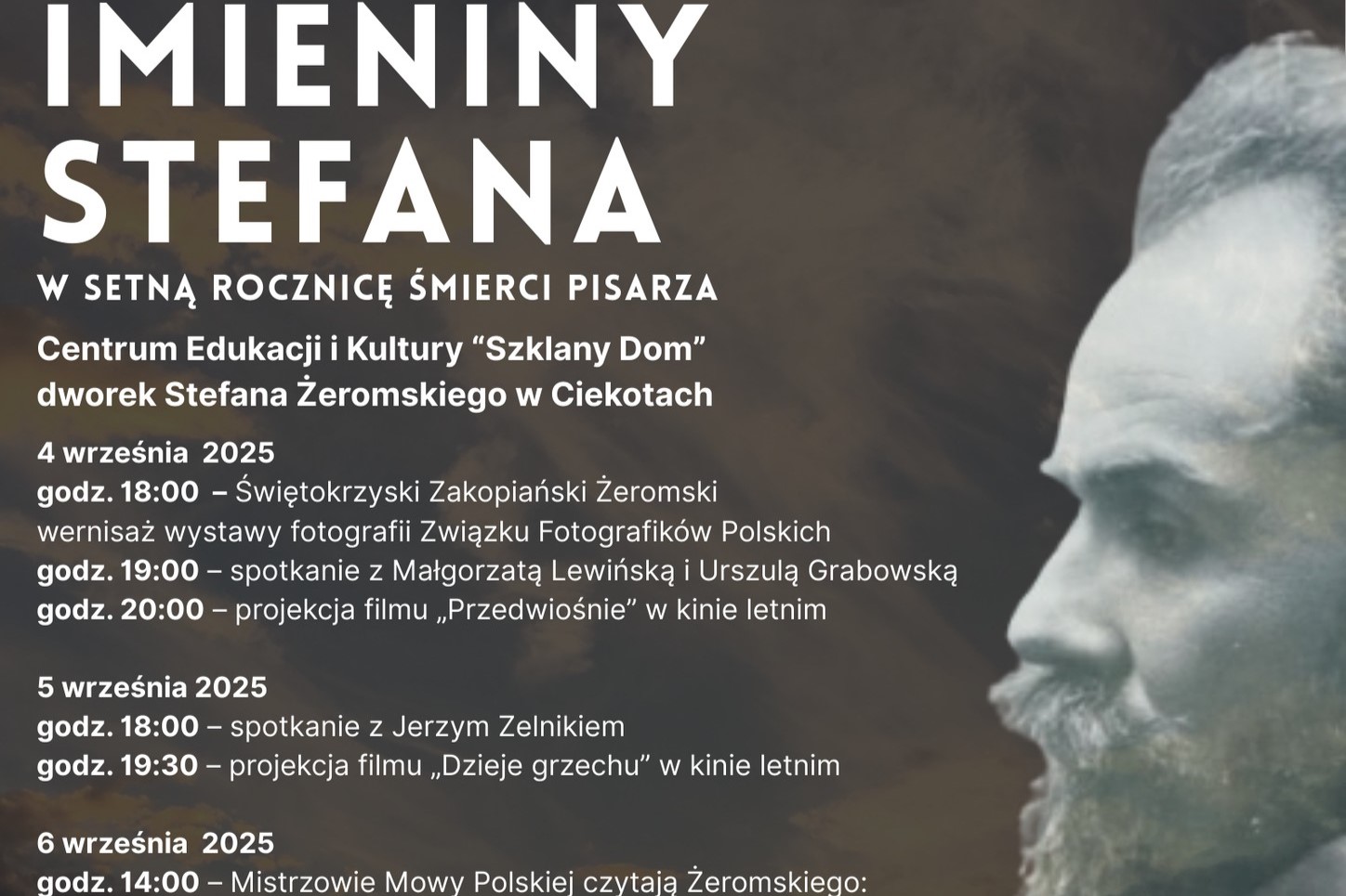 Przez trzy wieczory będą odbywać się spotkania z aktorami i projekcje filmów, które są adaptacjami dzieł Stefana Żeromskiego. 4 września o godzinie 19 organizatorzy zapraszają na spotkanie z kobietami Cezarego Baryki. W „Szklanym Domu” gościć będą Małgorzata Lewińska odtwórczyni roli Laury Kościenieckiej i Urszula Grabowska, odtwórczyni roli Karoliny Karusi Szarłatowiczówny. Podczas spotkania nie zabraknie opowieści z planu „Przedwiośnia”, a także rozmów o aktorskich i literackich inspiracjach. O godzinie 20 rozpocznie się projekcja filmu „Przedwiośnie” w reżyserii Filipa Bajona w kinie letnim.
