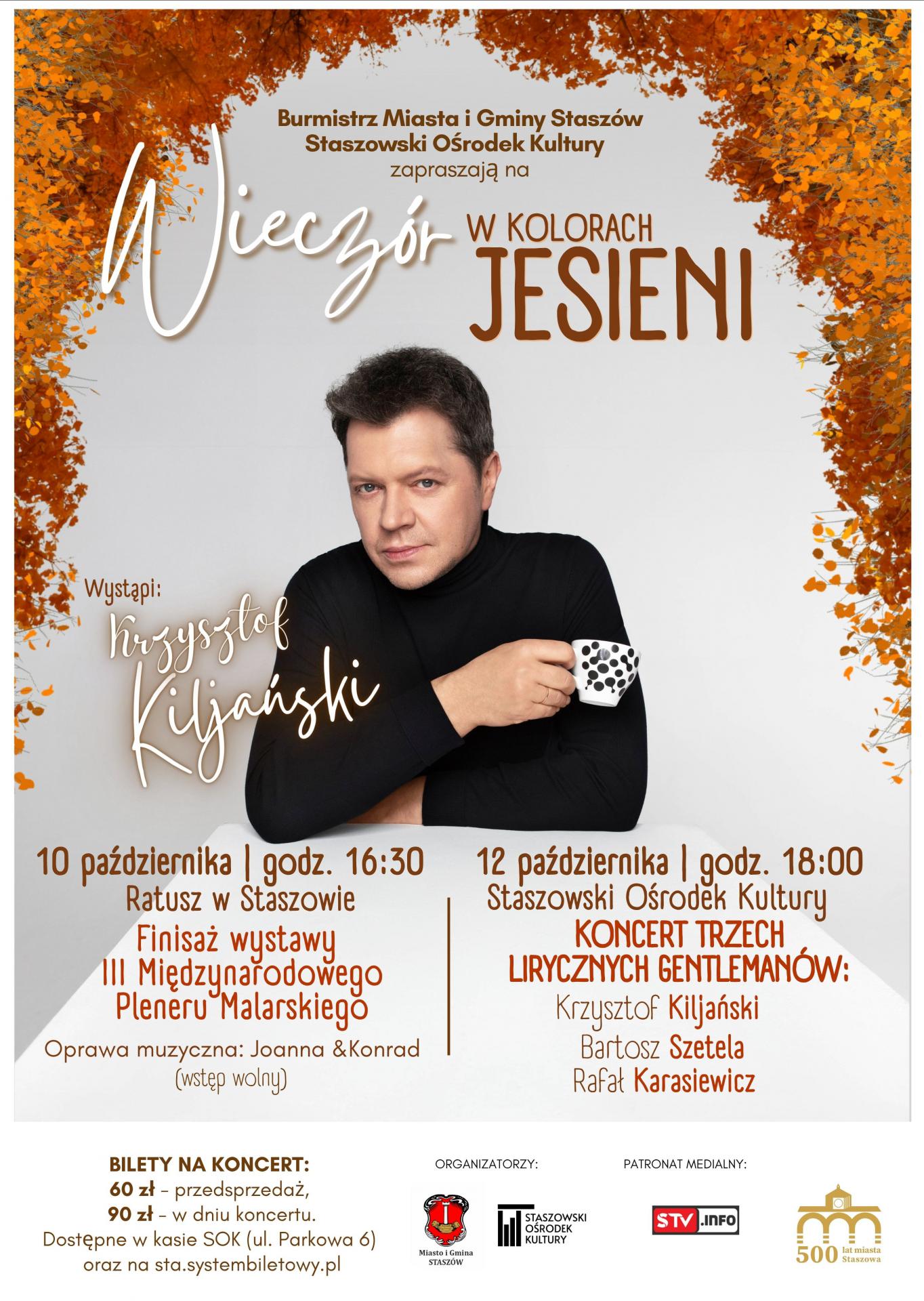 12 października o godzinie 18.00 w Staszowskim Ośrodku Kultury rozpocznie się koncert Krzysztofa Kiljańskiego – wokalisty o niepowtarzalnym głosie, znanego z przebojów „Prócz Ciebie Nic" i „Dzień Pomyłek". Nazywany polskim Sinatrą, laureat Fryderyków i Superjedynek, wprowadzi publiczność w świat nastrojowych melodii i elegancji, w towarzystwie wybitnych muzyków: Bartosza Szeteli (gitara basowa, kontrabas) i Rafała Karasiewicza (fortepian, aranżacje).