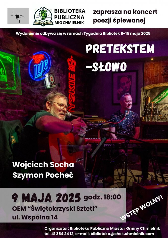 Wojtek Socha – pieśniarz, poeta i kompozytor, chmielniczanin, syn wieloletniego organisty Adama Sochy. Jest członkiem Klubu Literackiego „ASPEKT” w Ostrowcu Świętokrzyskim. W 2007 roku wspólnie z córka Karoliną wydał tomik wierszy zatytułowany „Koncert”. W 2010 roku wydał płytę pt. „Na strunie M” z autorskimi piosenkami, z której piosenka „Wirtualnie” zdobyła Muzycznego Scyzoryka w kategorii piosenka poetycka. Od 2017 roku pracuje w Radiu Ostrowiec, gdzie między innymi zajmuje się piosenką poetycką w autorskiej audycji „Synkopa słowa”. Współtworzy także audycję promującą jazz „Muzyka Nie-Dzieli” oraz kącik ze starszymi polskimi piosenkami „Szafa Gra”. W 2020 roku ukazał się jego drugi tomik poezji pod tytułem „Synkopa słowa”. Na scenie będzie towarzyszył mu Szymon Pocheć – organista, który skomponował muzykę do kilku wierszy Wojtka, w tym do tekstu „Korale szczęścia”, którego inspiracją był Chmielnik i jego historia. Koncert rozpocznie się o godzinie 18.