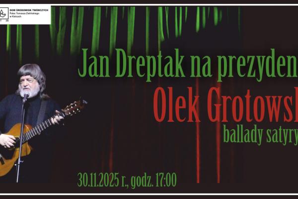 Koncert „Jan Dreptak na prezydenta!” – Olek Grotowski – ballady satyryczne odbędzie się w niedzielę, 30 listopada, o godzinie 17 w sali koncertowej Pałacyku Tomasza Zielińskiego. Bilety w cenie 30 zł do nabycia w kasie Domu Środowisk Twórczych oraz online.