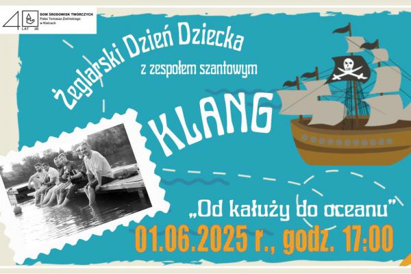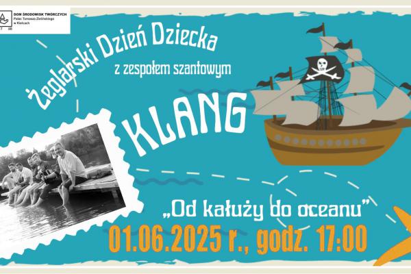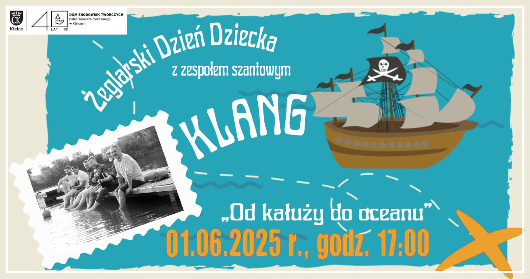Żeglarski Dzień Dziecka z zespołem szantowym Klang w ogrodzie Pałacyku Zielińskiego w Kielcach rozpocznie się o godzinie 17. Wstęp dla dzieci do 15 lat jest bezpłatny. Dzieci muszą być pod opieką osoby dorosłej, dla której bilet kosztuje 30 zł. Każdy dorosły może mieć pod opieką nie więcej niż pięcioro dzieci. Bilety o nabycia w kasie Domu Środowisk Twórczych w Kielcach oraz online.