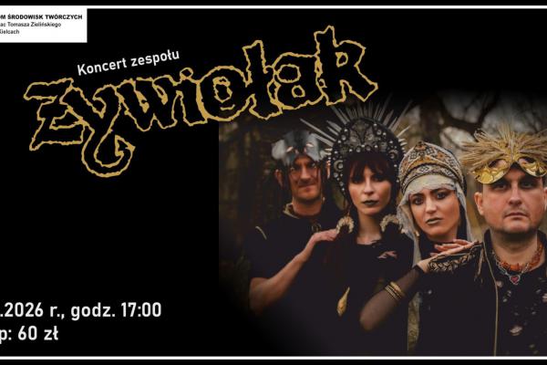 Koncert zespołu ŻYWIOŁAK w Pałacyku Zielińskiego w niedzielę, 22 lutego 2026 r. o godz. 17:00. Bilety w cenie 60 zł do nabycia w kasie Domu Środowisk Twórczych przy ul. Zamkowej 5 w Kielcach oraz online.