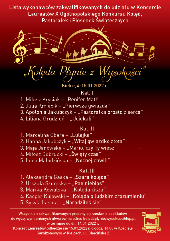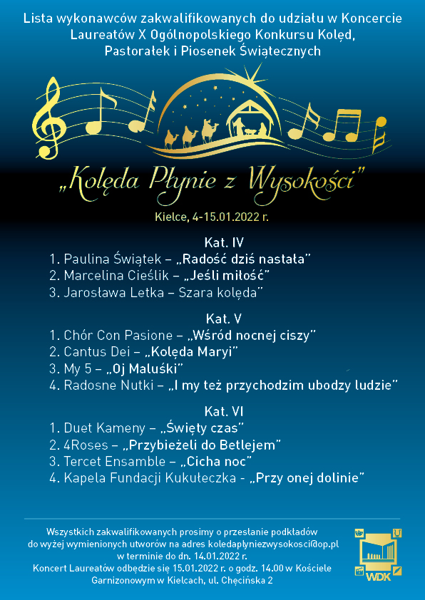 Wszyscy zakwalifikowani proszeni są o przesłanie podkładów do ww. utworów na adres koledaplyniezwysokosci@op.pl w terminie do 14.01.2022 r.