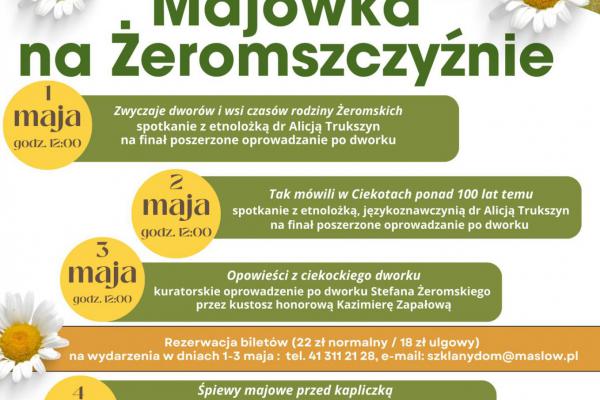 O godz. 12.00 organizatorzy majówki na Żeromszczyźnie zapraszają do Pracowni Dzieł i Piśmiennictwa o Stefanie Żeromskim i regionie świętokrzyskim w dworku w Ciekotach na spotkanie z dr Alicją Trukszyn poświęone Stefanowi Żeromskiemu i charakterystyce regionu świętokrzyskiego w jego epoce.