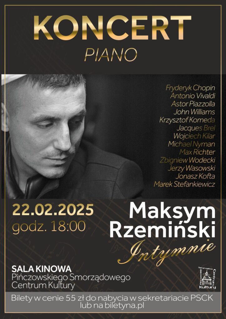 Artysta wystąpi 22 lutego o godzinie 18 w sali kinowej Pińczowskiego Samorządowego Centrum Kultury. W programie koncertu znajdą się premierowe wykonania utworów z najnowszej płyty Maksyma Rzemińskiego, która niebawem pojawi się w sprzedaży. Bilety w cenie 55 zł w sprzedaży w sekretariacie PSCK oraz przez serwis biletyna.pl