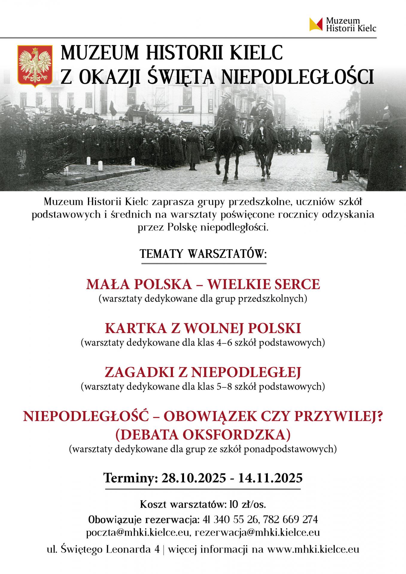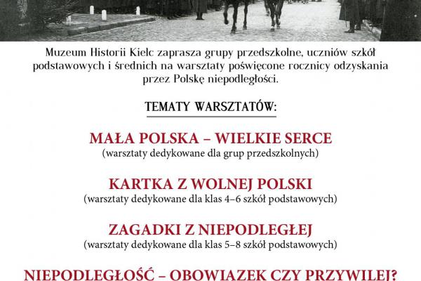 Od 28 października do 14 listopada 2025 r. Muzeum Historii Kielc zaprasza grupy przedszkolne, uczniów szkół podstawowych i średnich na warsztaty poświęcone rocznicy odzyskania niepodległości przez Polskę.