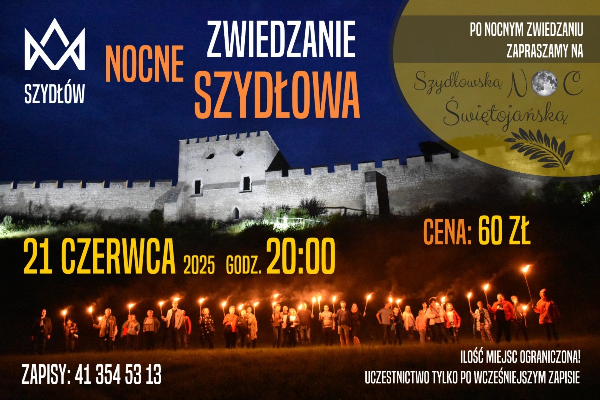 To już piąty rok, odkąd Szydłów oferuje tę nietypową formę zwiedzania. Nocą zabytki miasta zyskują zupełnie nowy, tajemniczy wymiar. Każdy uczestnik otrzymuje zapaloną pochodnię, a podczas dwugodzinnej wędrówki z przewodnikiem pozna historię miasta i jego najcenniejsze obiekty – mury miejskie, synagogę, zamek, Bramę Krakowską, kościoły oraz ruiny szpitala i kościoła św. Ducha.