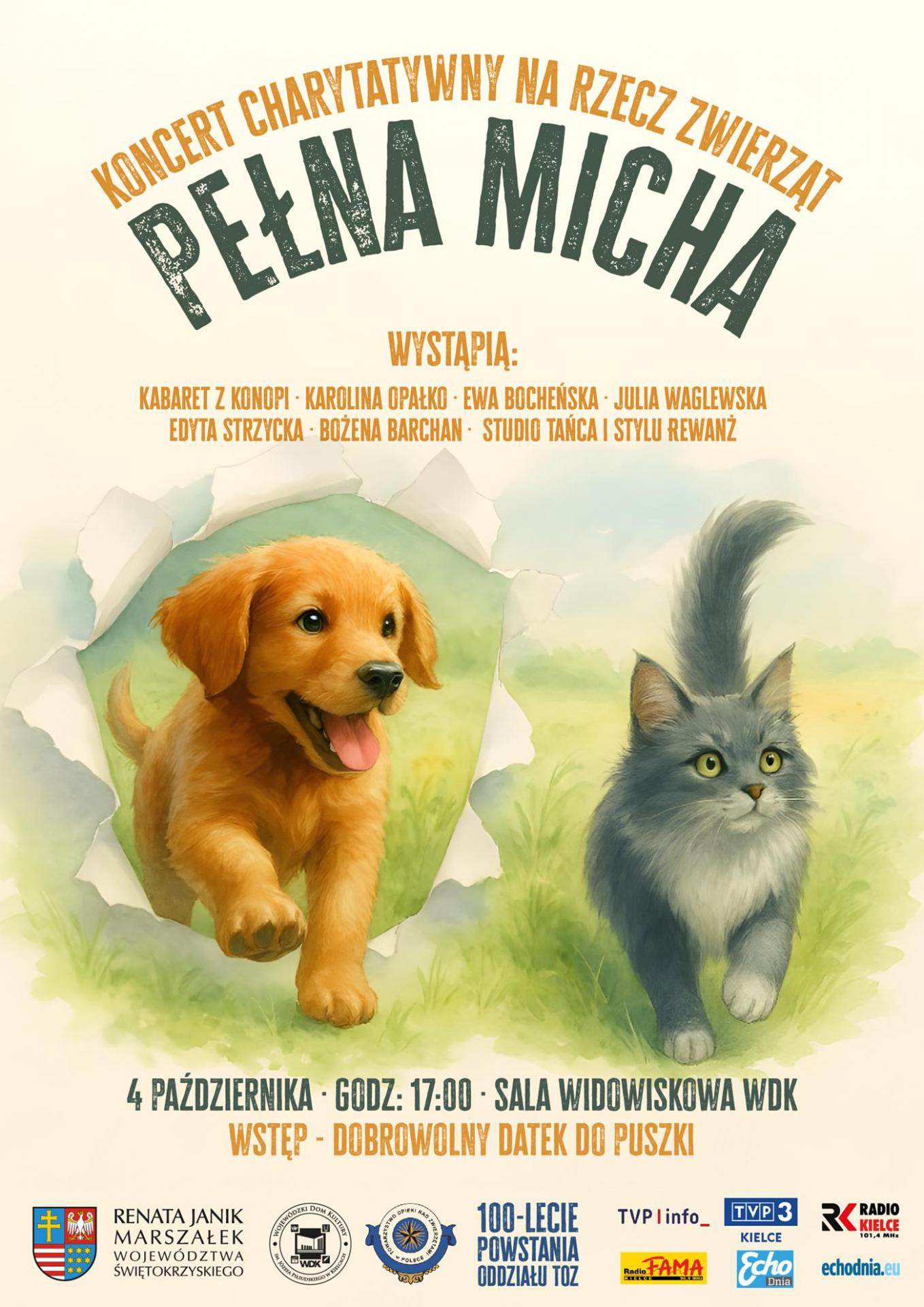 Wstęp na koncert to dobrowolna cegiełka wrzucona do puszki. Każda złotówka trafia do TOZ Kielce i zamienia się w: pełną miskę, ciepłe schronienie, pomoc weterynaryjną dla potrzebujących zwierząt.