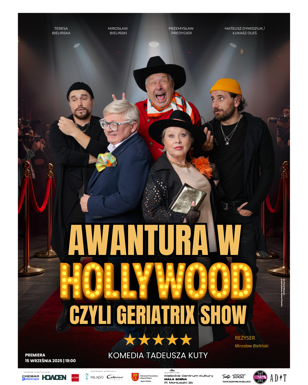 Tak zaczyna się „Awantura w Hollywood” – trzyaktowa komedia Tadeusza Kuty, autora, który potrafi rozśmieszyć do łez i chwilę później wzruszyć do milczenia. Próby przypominają rytuał szaleństwa: tekst w rozsypce, scenografia w kartonach, garderoba z odzysku, a emocje – na granicy wybuchu. Dialogi balansują między farsą a liryzmem, groteską a realnością. Bohaterowie grają sztukę o dwojgu samobójcach stojących na dachu – balansując jednocześnie nad przepaścią własnej przeszłości.