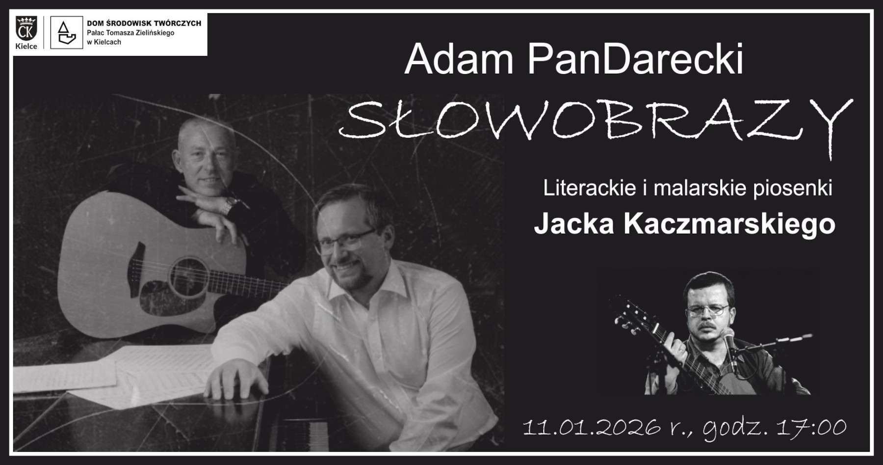 Koncert Słowobrazy, czyli literackie i malarskie piosenki Jacka Kaczmarskiego odbędzie się w Pałacyku Zielińskiego w niedzielę, 11 stycznia, o godzinie 17. Bilety w cenie 40 zł do nabycia w kasie Domu Środowisk Twórczych w Kielcach oraz online.