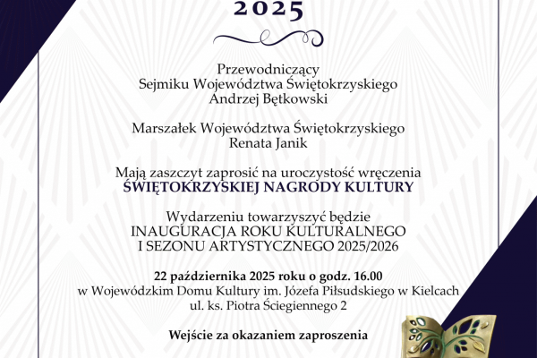 Tegoroczna gala Świętokrzyskiej Nagrody Kultury odbędzie się 22 października o godz. 16.00 w Wojewódzkim Domu Kultury w Kielcach. Na uroczystość zapraszają Renata Janik, marszałek Województwa Świętokrzyskiego i Andrzej Bętkowski, przewodniczący Sejmiku Województwa Świętokrzyskiego.