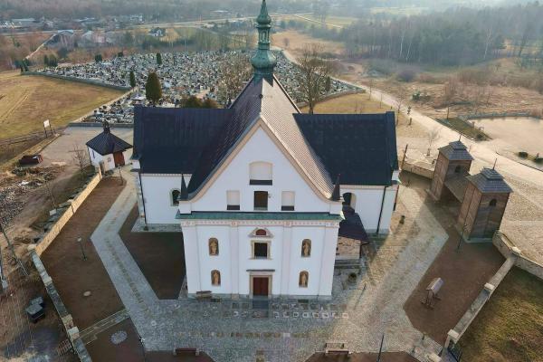 Tuż obok znajduje się unikatowa modrzewiowa dzwonnica z 1779 roku, wzniesiona w konstrukcji słupowej. Jej sylwetka – w formie dwóch wież połączonych bramą – należy do najbardziej malowniczych zabytków sakralnych regionu.