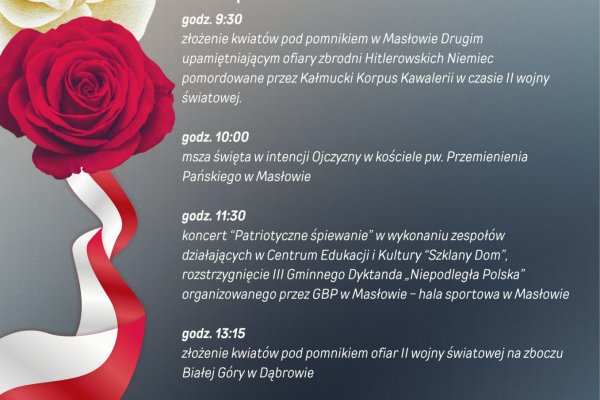 Koncert pt. Patriotyczne śpiewanie. Wystąpią w nim artyści działający w Centrum Edukacji i Kultury "Szklany Dom": "Barczanki", "Brzezinianki", Chór "Masłowianie", "Dąbrowianki", "Domaszowianie", Grupa Artystyczna "Golica", Kopcowianki, Lubrzanka, Nowe Masłowianki, Zespół Pieśni i Tańca Żeromszczyzna oraz masłowski Klub Seniora.