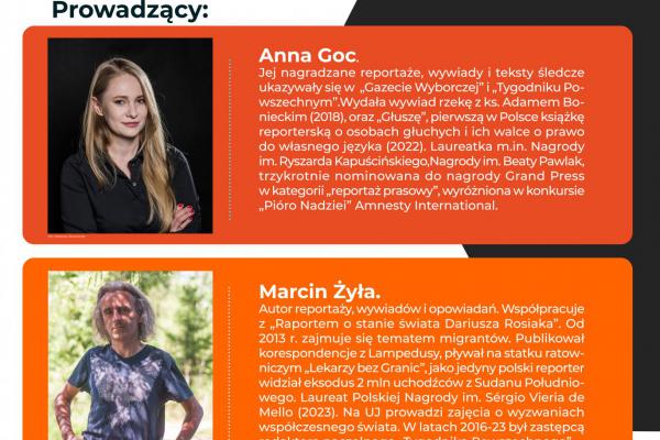 Warsztaty skierowane są do osób, które prowadzą profil w mediach społecznościowych, początkujących dziennikarzy lub osób zbierających materiały do książki. Podczas nich uczestnicy dowiedzą się, jak wybrać najważniejszych bohaterów, przyjrzą się bohaterowi zbiorowemu i temu, jak portretować grupę oraz nauczą się, jaki pisać, żeby opowieść wciągnęła czytelnika. Prowadzący opowiedzą też o źródłach, informatorach i weryfikacji faktów oraz omówią dziennikarskie standardy i granice, których nie należy przekraczać.