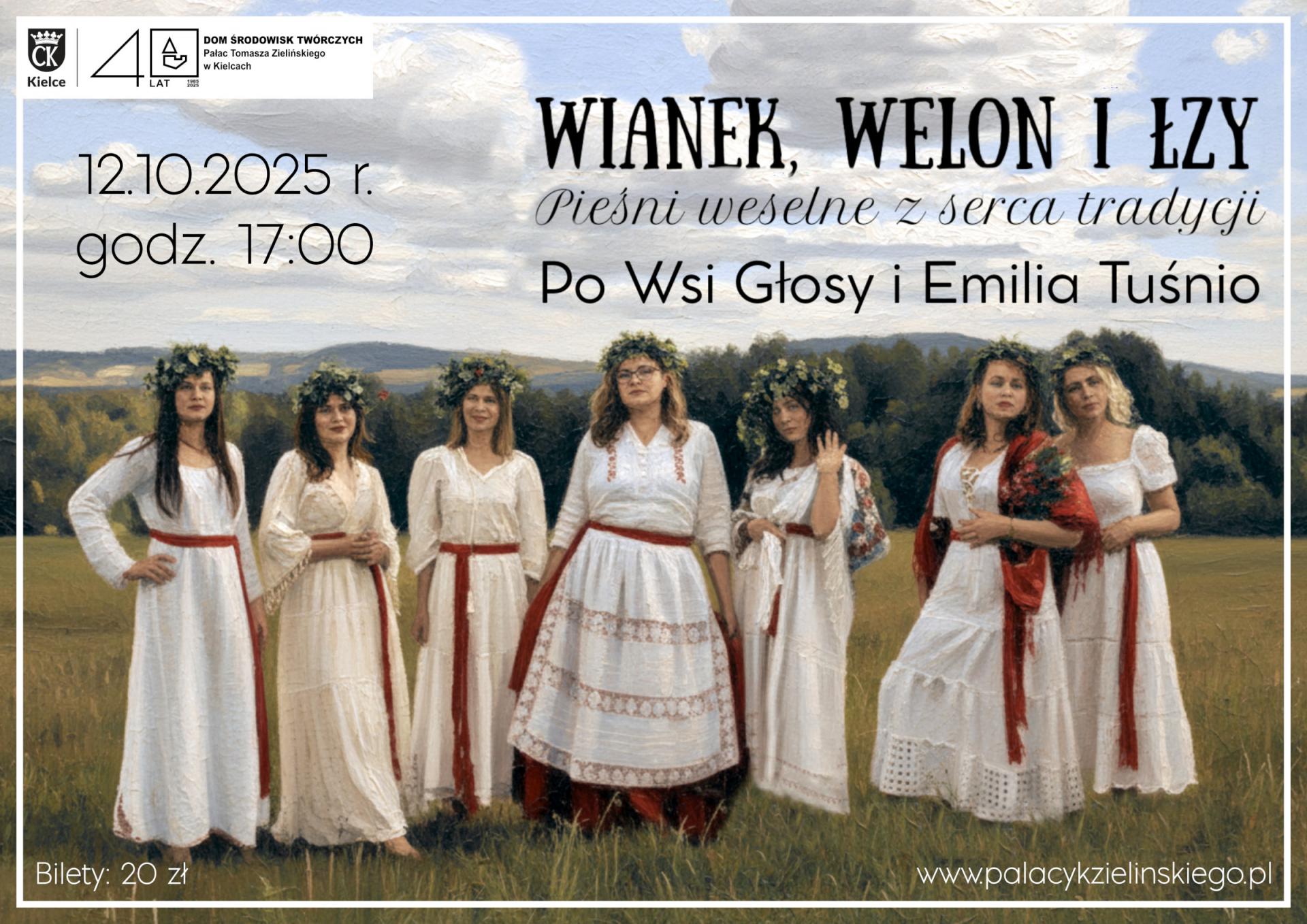 Podczas koncertu zabrzmią pieśni panieńskie i zaręczynowe, ślubne i oczepinowe, pełne śmiechu, wzruszeń, żalu i nadziei. W tych pieśniach wianek i welon nie są tylko ozdobami, to symbole ważnej przemiany, jaką przechodzi kobieta. Koncert jest śpiewaną opowieścią o przejściu z rodu ojca do rodu męża – z wiankiem na głowie i łzą w oku. To muzyczna podróż przez radość, tęsknotę, rytuał i ludowe piękno, przekazywane z pokolenia na pokolenie. Koncert w wykonaniu zespołu Po Wsi Głosy we współpracy z Emilią Tuśnio ze Stowarzyszenia Etnorium oraz zespołu DYM, która opowie o tradycjach weselnych i przybliży kontekst obrzędów wybrzmiewających w pieśniach.