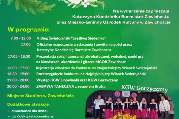 O godzinie 19 rozstrzygnięty zostanie konkurs na najpiękniejszy wianek świętojański. Następnie na scenie wystąpią Koła Gospodyń Wiejskich Linowianki oraz Gorzyczany, a o godzinie 20 rozpocznie się zabawa taneczna, którą poprowadzi zespół Brutta.