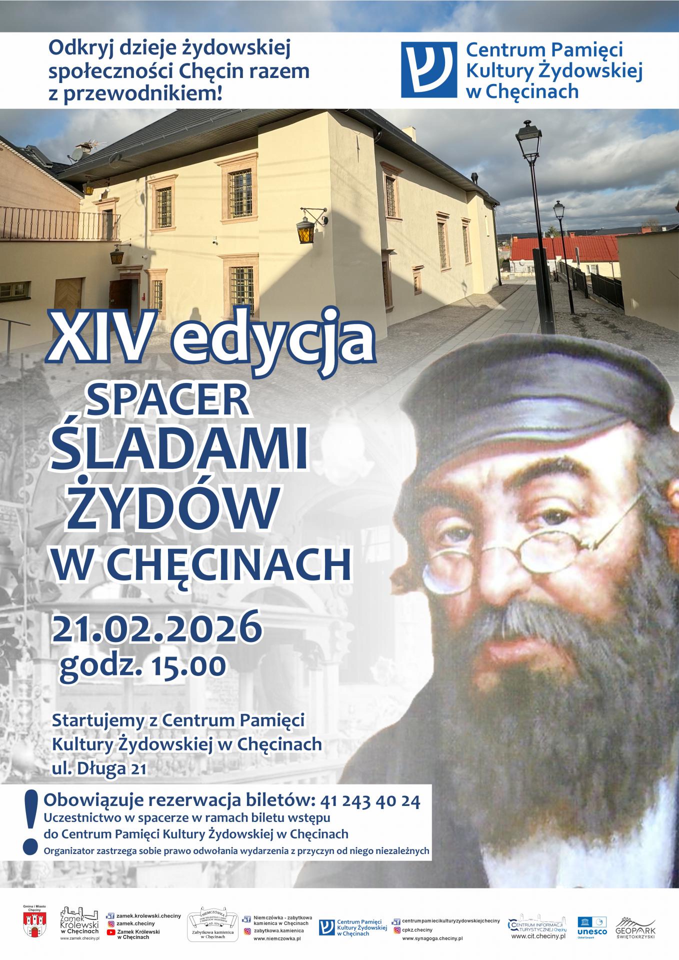 To niepowtarzalna okazja, by w zimowej scenerii odkryć miejsca i historie związane z żydowską społecznością, która przez wieki współtworzyła nasze miasto. Każdy punkt trasy to opowieść o ludziach, ich codziennym życiu, tradycjach i losach zapisanych w przestrzeni Chęcin. Spacer rozpocznie się od centrum pamięci, skąd uczestnicy wyruszą m.in. do mykwy, zabytkowej kamienicy „Niemczówka”, oraz dawnego domu modlitwy. Udział w wydarzeniu pozwoli lepiej zrozumieć historię i kulturę żydowską .