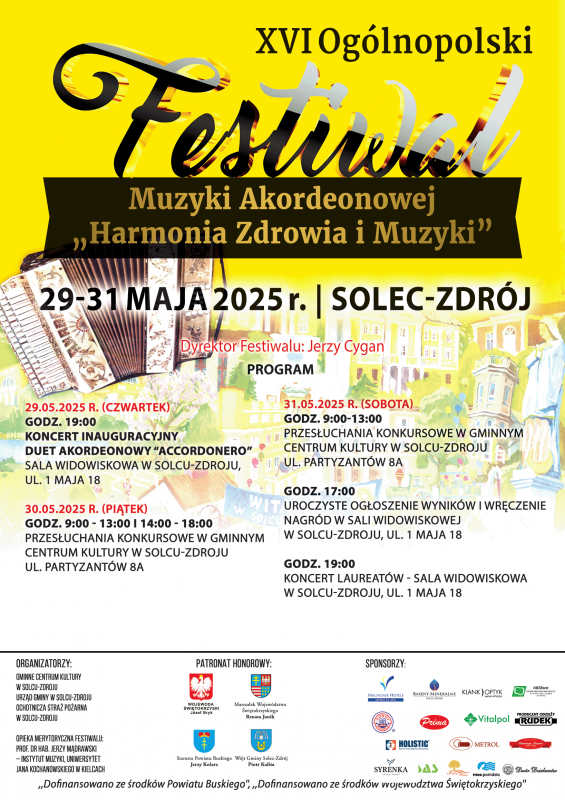 Festiwal rozpocznie się w czwartek, 29 maja, o godzinie 19 koncertem inauguracyjnym w sali widowiskowej w Solcu-Zdroju. Przed publicznością wystąpi Duet Akordeonowy Accordonero. Następnie, 30 i 31 maja w Gminnym Centrum Kultury będą odbywać się przesłuchania konkursowe i wręczone zostaną nagrody. Laureaci zaprezentują się podczas koncertu, który odbędzie się 31 maja o godzinie 19 w sali widowiskowej.
