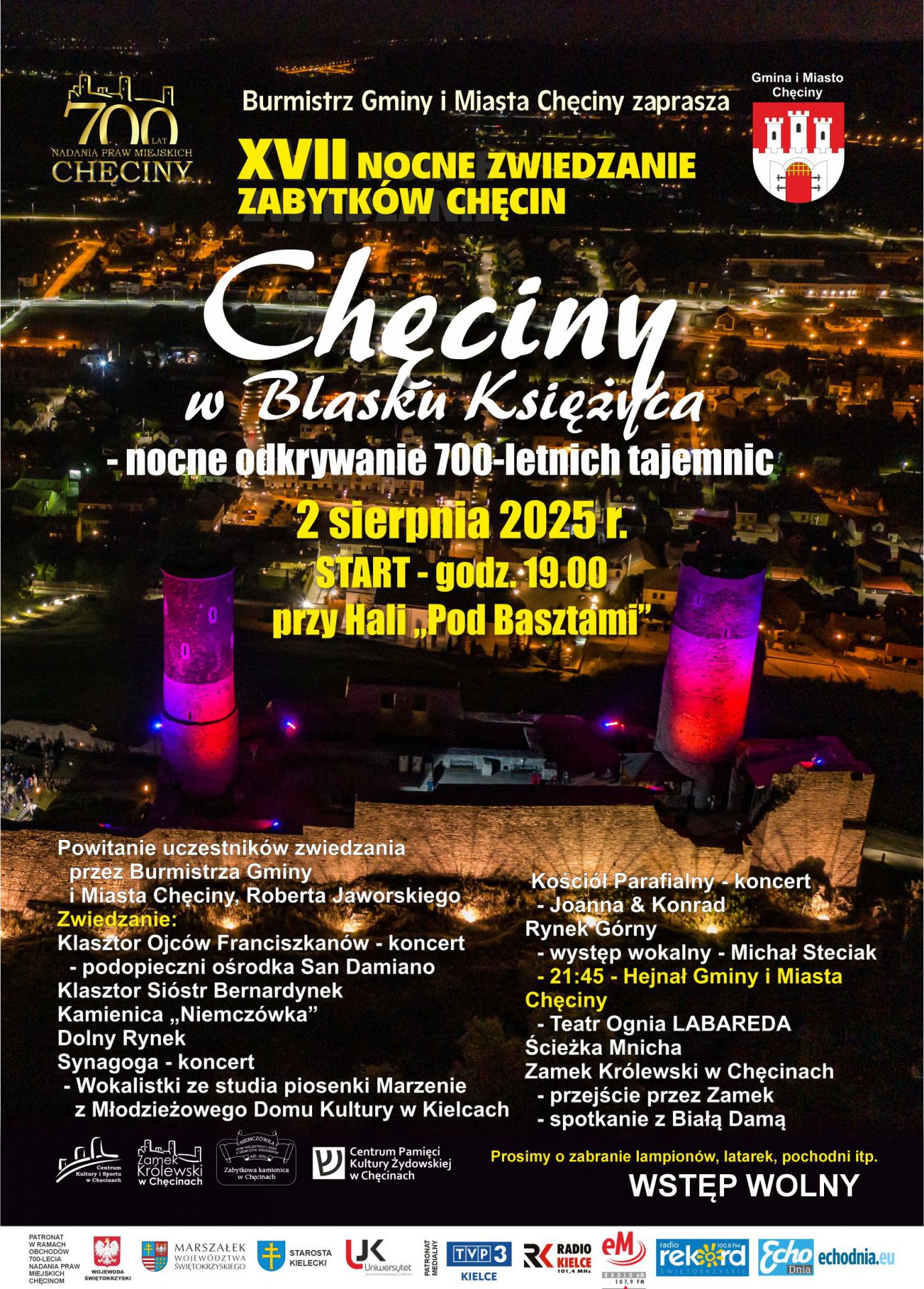 Będzie można również zobaczyć Teatr Ognia LABAREDA, przejść przez Ścieżkę Mnicha i Zamek oraz spotkać się z Białą Damą. O godzinie 21.45 po raz pierwszy na Rynku w Chęcinach zabrzmi Hejnał Gminy i Miasta Chęciny.