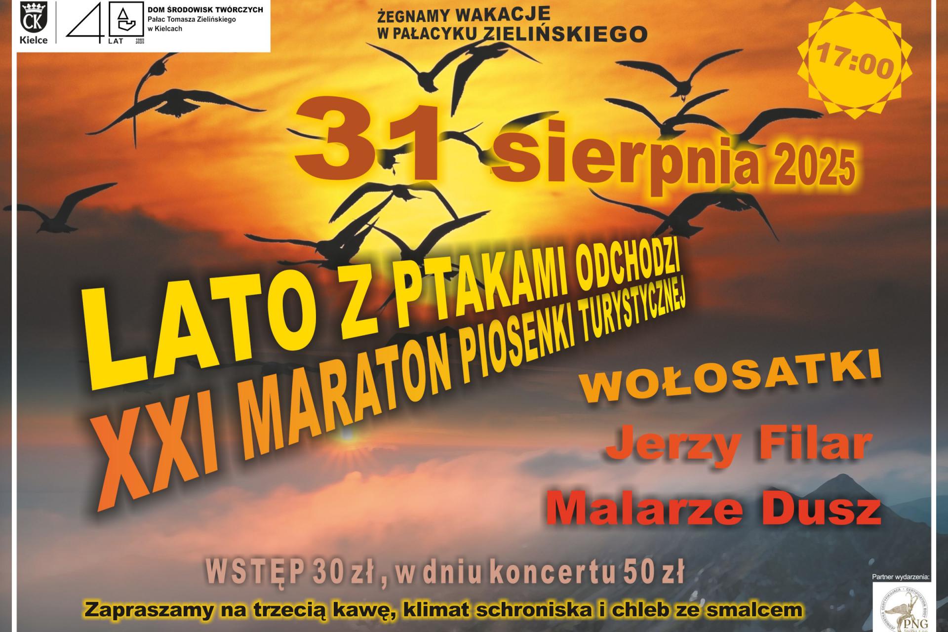 Lato z Ptakami Odchodzi – XXI Maraton Piosenki Turystycznej i Poetyckiej odbędzie się w ogrodzie Pałacyku Zielińskiego w Kielcach. Bilety w cenie 30 złotych, a w dniu koncertu 50 złotych (dla dzieci i młodzieży szkolnej 5 złotych) do nabycia w kasie Domu Środowisk Twórczych w Kielcach oraz online.