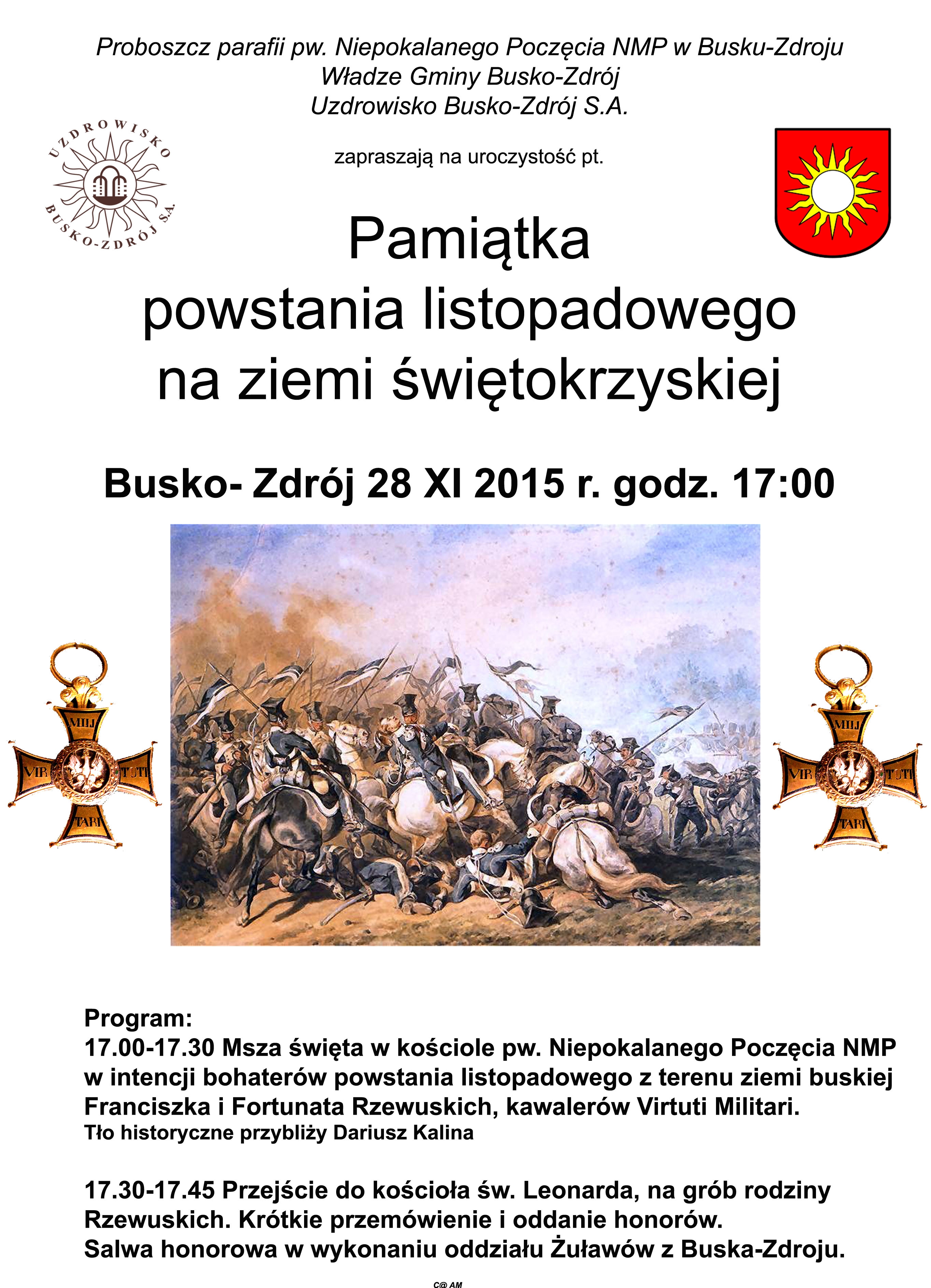 Dariusz Kalina to wielki miłośnik regionu i jego historii. W archiwach spędza długie godziny w poszukiwaniu nowych informacji o ziemi świętokrzyskiej. Szczególnie ukochał sobie Chęciny i wciąż odkrywa coś nowego w dziejach tego miasteczka. Jest autorem wielu wydawnictw o charakterze zabytkoznawczym. Spotkanie z Dariuszem Kaliną odbędzie się 28 listopada o godzinie 17.00 w kościele Niepokolanego Poczęcia w Busku-Zdroju. Wstęp wolny. Dariusz Kalina przybliży tło historyczne wybuchu powstania listopadowego. W kościele odbędzie się również msza święta w intencji bohaterów powstania z terenu ziemi buskiej - Franciszka i Fortunata Rzewuskich - kawalerów Virtuti Militari. O godzinie 17.30 uczestnicy spotkania przejdą do kościoła Świętego Leonarda w Busku-Zdroju, na grób rodziny Rzewuskich.