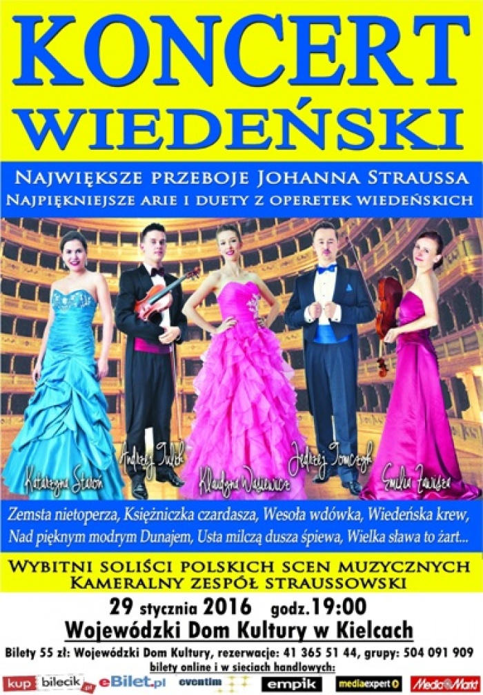 Podczas gali wystąpią soliści operowi. Towarzyszyć im będą polscy kameraliści młodego pokolenia, występujący na co dzień z najlepszymi orkiestrami i dyrygentami w Polsce i Europie. Na scenie pojawią się laureaci międzynarodowych konkursów muzycznych, wirtuozi skrzypiec, fortepianu, wspaniali soliści polskiej estrady. Zabrzmią największe przeboje Johanna Straussa, nie zabraknie także popisowych arii z najsłynniejszych operetek "Zemsta nietoperza", "Baron cygański", "Wesoła wdówka", "Księżniczka Czardasza" oraz "Kraina Uśmiechu". Publiczność usłyszy m.in.: walc "Nad pięknym modrym Dunajem", arię "Wielka sława to żart", duet wszech czasów "Usta milczą dusza śpiewa" czy polkę "Tritsch- Tratsch". Koncert programowo nawiązywał będzie do tradycyjnych gali i noworocznych koncertów odbywających się w Wiedniu.