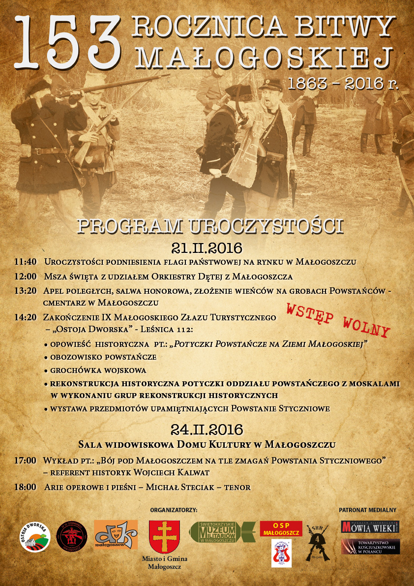 W środę, 24 lutego, zapraszamy również do Domu Kultury w Małogoszczu. O godz. 17.00 odbędzie sie tam wykład pt. "Bój pod Małogoszczem na tle zmagań powstania styczniowego", który wygłosi historyk Wojciech Kalwat. Na godz. 18.00 zaplanowano koncert arii operowych i pieśni w wykonaniu tenora Michała Steciaka.