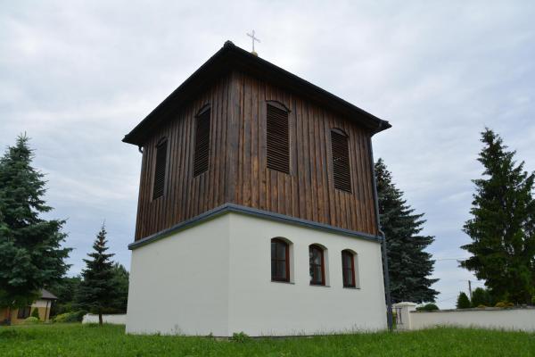 Dzwonnica zlokalizowana jest na północny wschód od kościoła. Obecna wystawiona została ok.1782 roku na miejscu starszej. Niestety jej architektura nie próbuje nawet nawiązać poziomem do kościoła – nawet jak na osiemnastowieczne dzwonnice jest niesłychanie uboga, stanowiąc raczej rozwiązanie stricte techniczne, niż dzieło architektoniczne. Jednak skontrastowanie drewnianych płaszczyzn dzwonnicy z bujną zielenią przykościelnego cmentarza i rozlewających się na szalunku plam światła poprzeplatanych głębokimi cieniami rzucanymi przez otaczające ją drzewa sprawia, że ma ona niezaprzeczalne walory plastyczne. By je zobaczyć, trzeba tam być jednak w letni słoneczny dzień, najlepiej w porze około południowej.