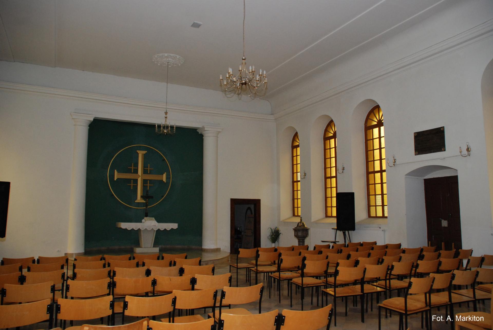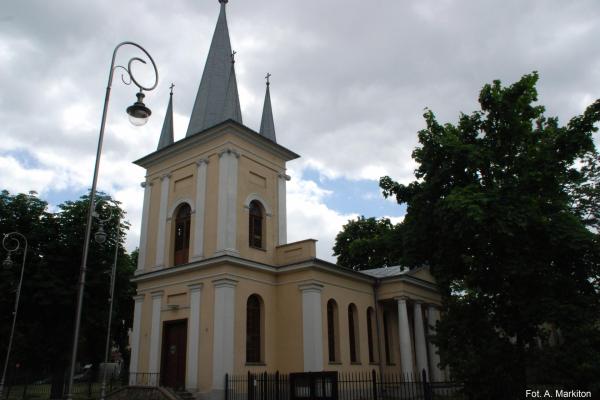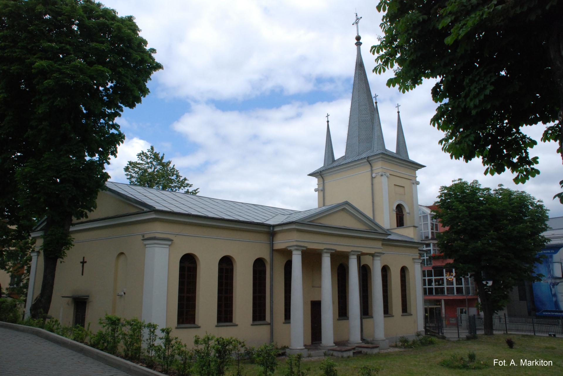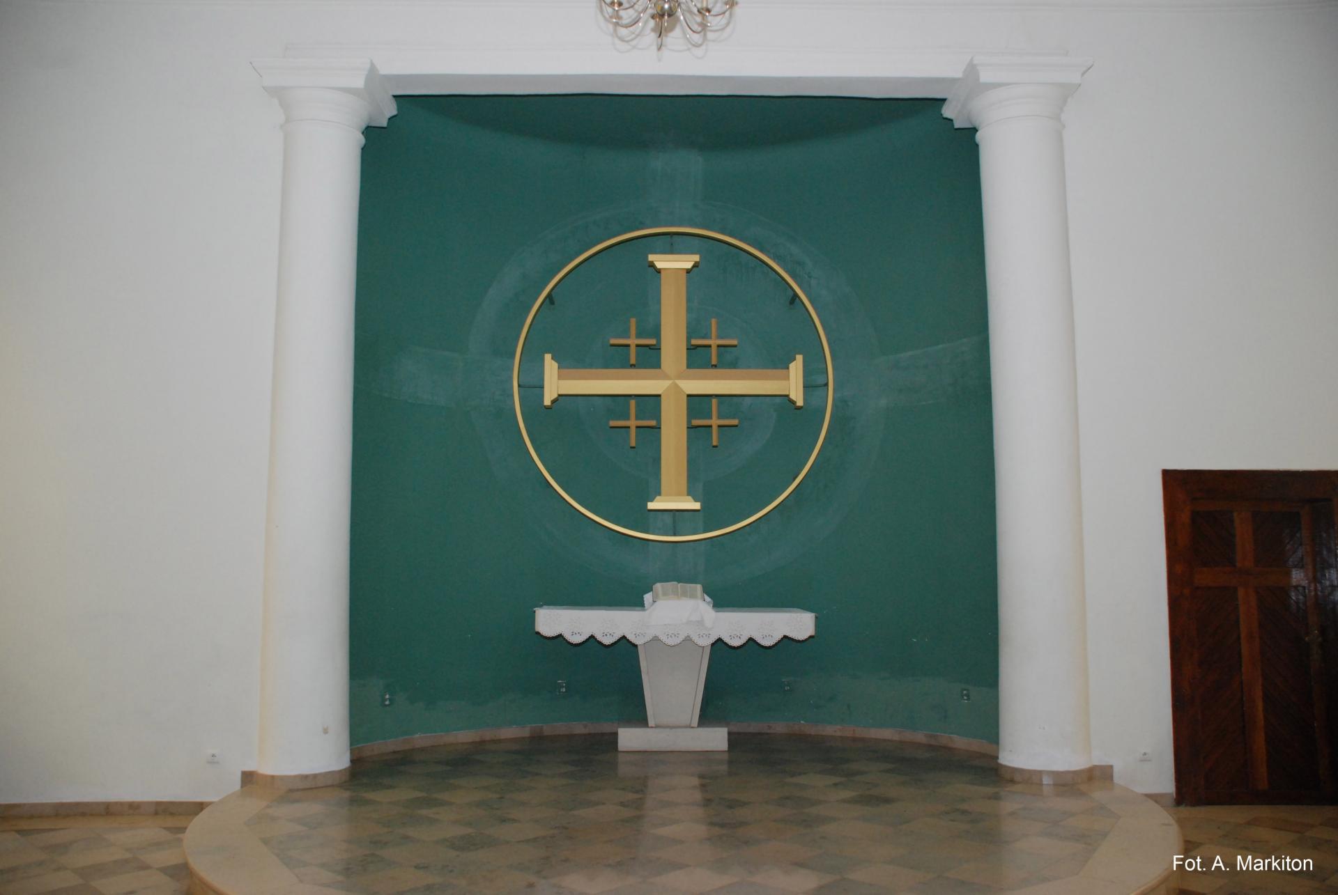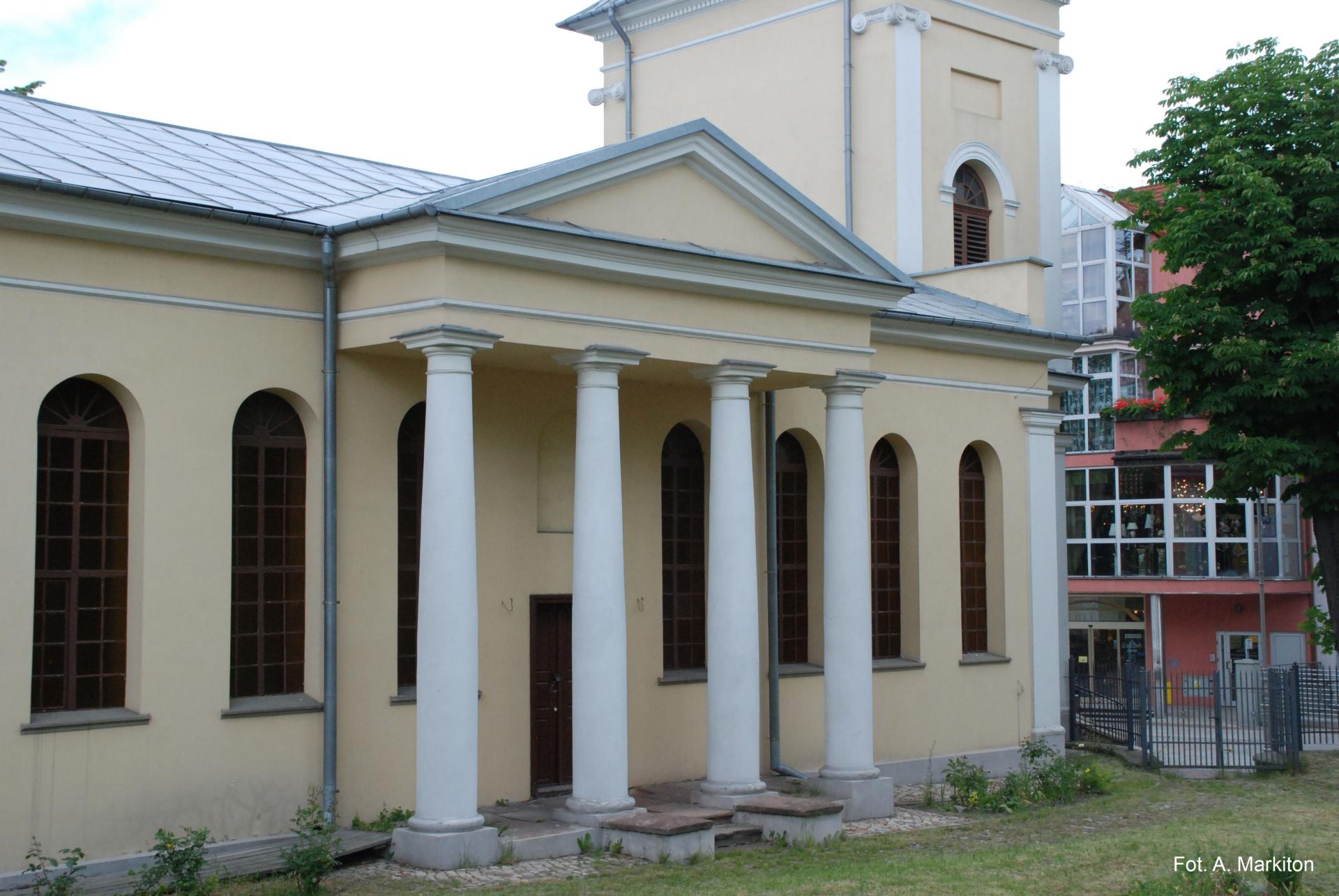 Stylowo - obiekt jest klasycystyczny. Składa się z jednonawowego korpusu i dwukondygnacyjnej wieży, zwieńczonej bardzo stromym, ostrosłupowym dachem, z czterema mniejszymi ostrosłupami ustawionymi na jej narożnikach wieży. Do korpusu, symetrycznie od wschodu i zachodu, dostawione są dwa czterokolumnowe portyki, tworząc jak gdyby plan krzyża. Nawę nakrywa płaski strop, a półkoliste w planie prezbiterium wytworzone jest przy pomocy wewnętrznych ścianek, oddzielających także część przeznaczoną dla wiernych od zakrystii i niewielkiego składziku. Podłużne ściany kościoła przeprute są wysokimi, półkoliście zamkniętymi oknami, których duża powierzchnia nadaje całej budowli cech lekkości. W czasach PRL–u budynek użytkowany był przez Kościół polsko-katolicki. Potem powrócili tu ewangelicy, a po remoncie i uroczystej mszy, która odbyła się tu 8 września 2001 roku, kościół ma pełnić funkcję świątyni ekumenicznej.