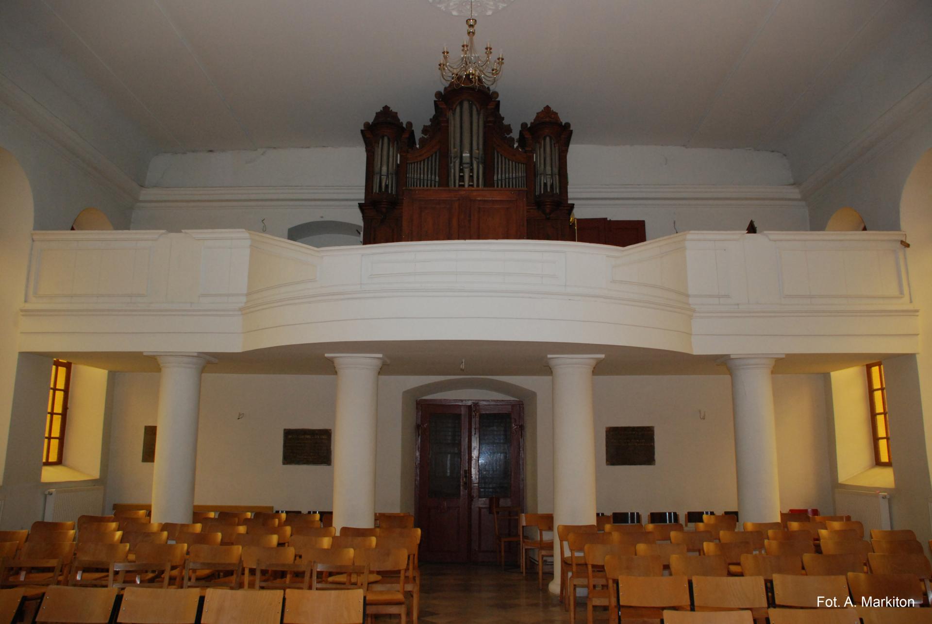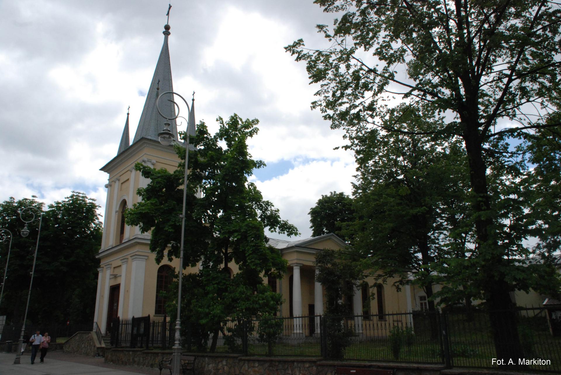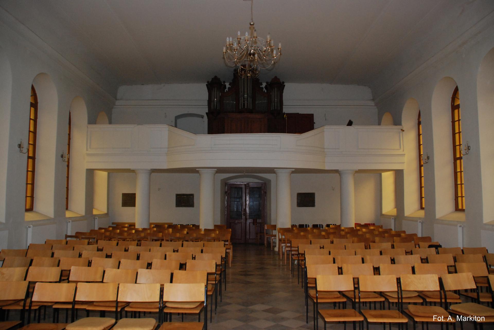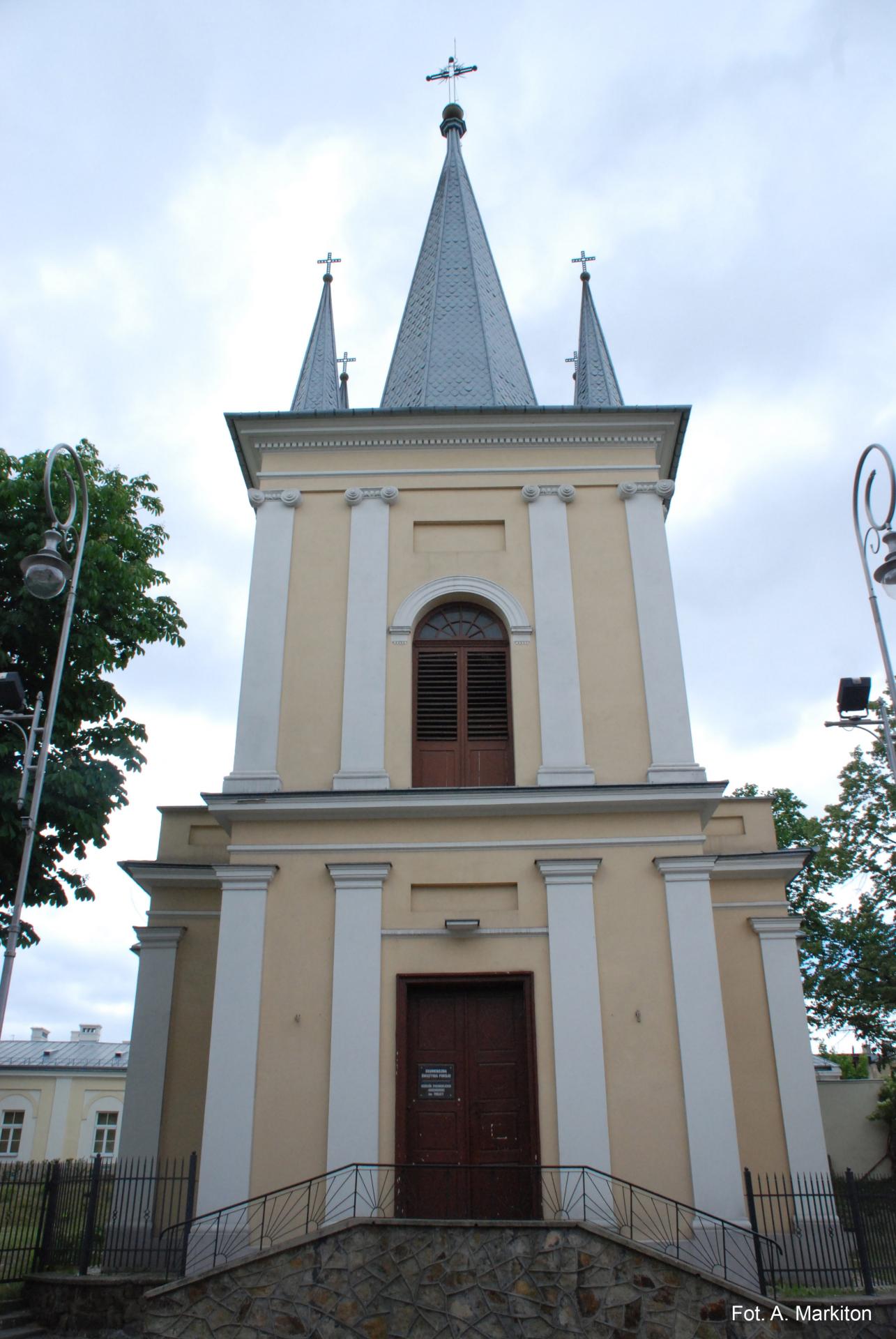 Stylowo - obiekt jest klasycystyczny. Składa się z jednonawowego korpusu i dwukondygnacyjnej wieży, zwieńczonej bardzo stromym, ostrosłupowym dachem, z czterema mniejszymi ostrosłupami ustawionymi na jej narożnikach wieży. Do korpusu, symetrycznie od wschodu i zachodu, dostawione są dwa czterokolumnowe portyki, tworząc jak gdyby plan krzyża. Nawę nakrywa płaski strop, a półkoliste w planie prezbiterium wytworzone jest przy pomocy wewnętrznych ścianek, oddzielających także część przeznaczoną dla wiernych od zakrystii i niewielkiego składziku. Podłużne ściany kościoła przeprute są wysokimi, półkoliście zamkniętymi oknami, których duża powierzchnia nadaje całej budowli cech lekkości. W czasach PRL–u budynek użytkowany był przez Kościół polsko-katolicki. Potem powrócili tu ewangelicy, a po remoncie i uroczystej mszy, która odbyła się tu 8 września 2001 roku, kościół ma pełnić funkcję świątyni ekumenicznej.