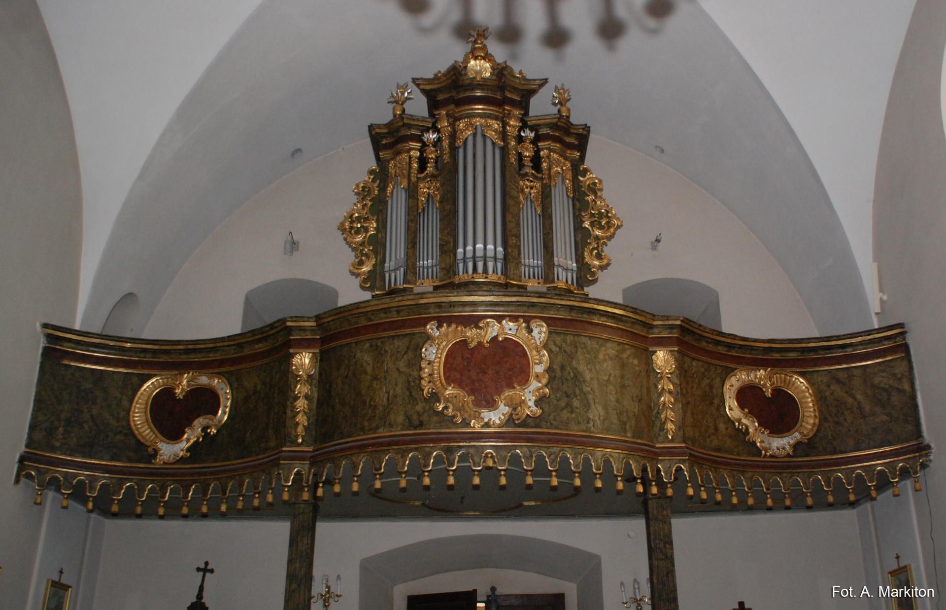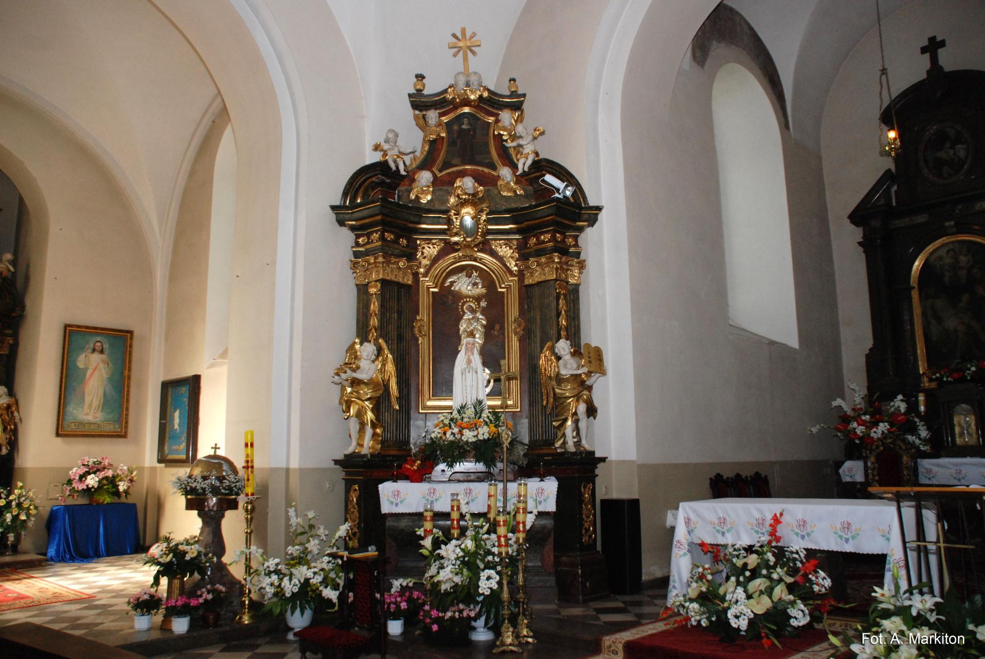 Ołtarz główny, ołtarze boczne, ambona i organowy prospekt przypisuje się warsztatowi Antoniego Frączkiewicza