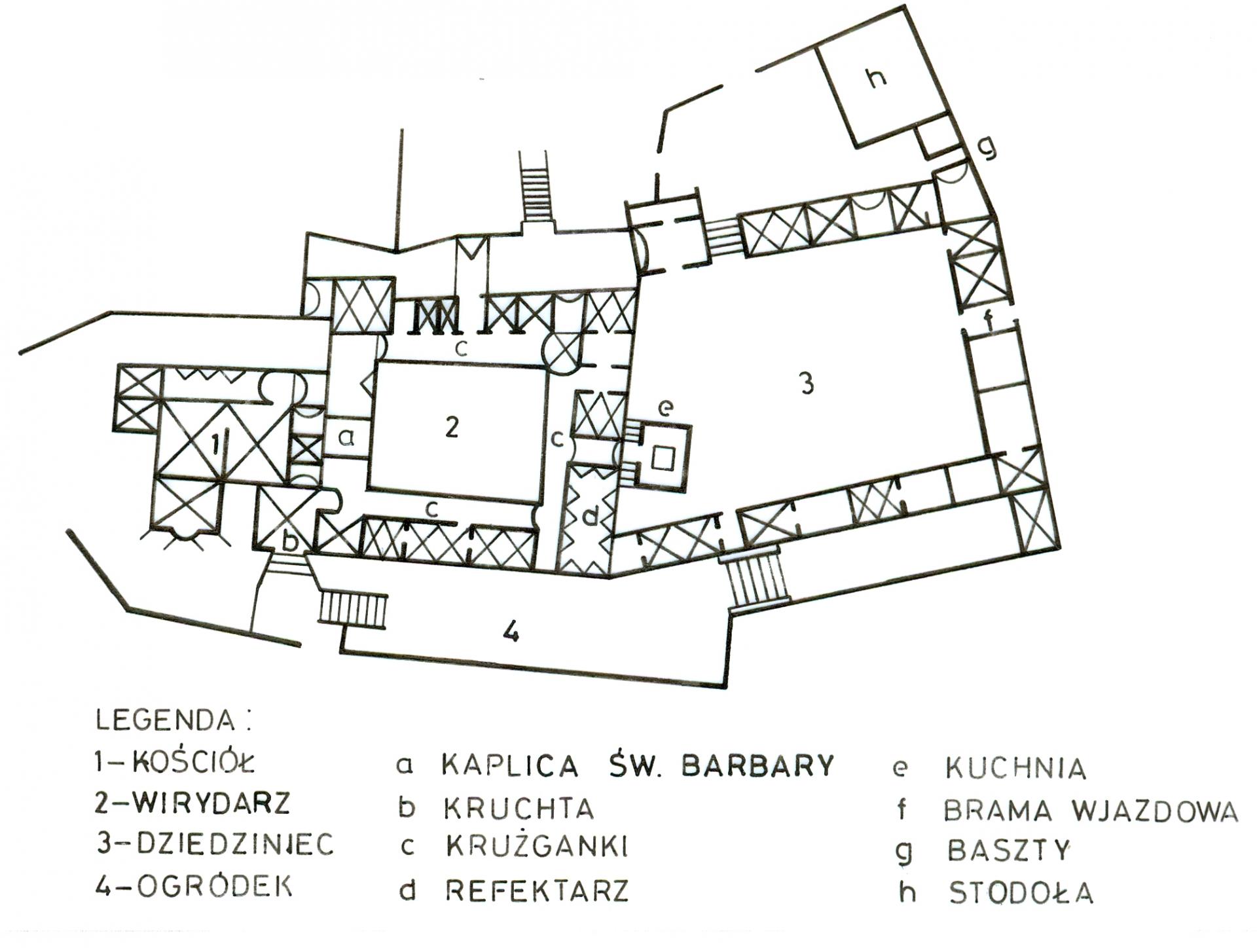 W roku 1631 zgodnie z wolą fundatora kościół przejęli sprowadzeni tu bernardyni i do wschodniej części świątyni dobudowali klasztor, otaczający prostokątny krużgankowy wirydarz. Zachodnim skrzydłem wirydarza jest sam krużganek, którego jedno z przęseł stanowi podstawę wieży dzwonnicy, górującej nad całym zespołem. Wzdłuż północnej ściany kościoła dobudowano przykryty kolebkowym sklepieniem korytarz prowadzący do usytuowanej od zachodu zakrystii. Na wschód od klasztoru dobudowano trójskrzydłowy zespół obiektów gospodarczych. W jego wschodnim skrzydle oś akcentowała przejazdowa brama a narożniki niewysokie baszty. Całość założenia otaczał mur.