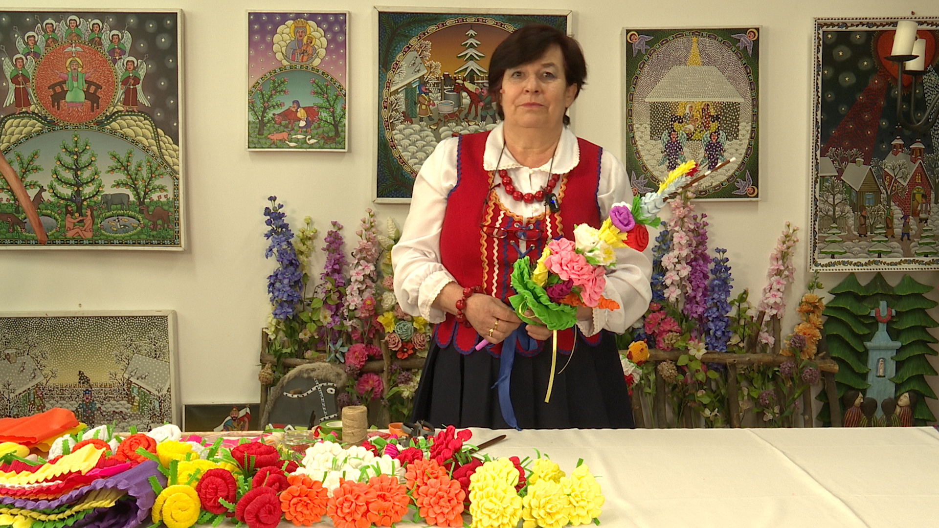 Sposób wykonania palemki prezentuje Iwona Dziedzic z Koła Gospodyń Wiejskich w Szczecnie. Warsztaty odbyły się podczas Kiermaszu Wielkanocnego 12 kwietnia 2025 r. w Wojewódzkim Domu Kultury w Kielcach.