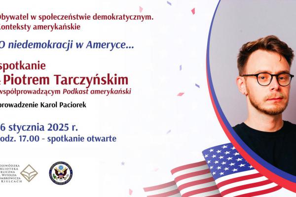 16 stycznia (w czwartek) o godz. 17.00 w Wojewódzkiej Bibliotece Publicznej w Kielcach odbędzie się spotkanie z Piotrem Tarczyńskim – historykiem, doktorem nauk politycznych, tłumaczem i współtwórcą "Podkastu amerykańskiego", zatytułowane "O niedemokracji w Ameryce". Wstęp wolny.