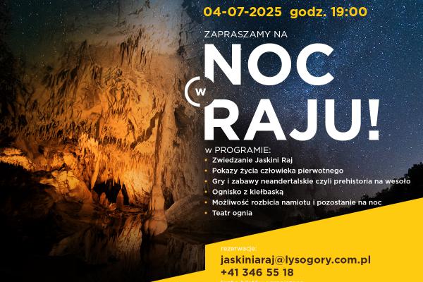 W najbliższy piątek – 4 lipca – o godz. 19.00 w Jaskini Raj pod Kielcami będzie można przeżyć niezapomnianą przygodę wakacyjną. Organizatorzy "Nocy w RAJU" zapraszają (m.in.) na zwiedzanie jaskini, pokazy, gry i zabawy oraz pokazy wykonawców z teatru ognia.