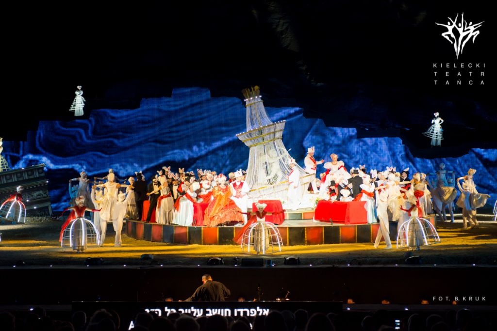 Pierwszą scenę rozpoczęli tancerze Kieleckiego Teatru Tańca odgrywając na tle projekcji wielkiego zegara upływający czas. Również trzeci akt zaczął się mocnym, tanecznym uderzeniem naszych artystów. Tym razem scena należała wyłącznie dla nich. Porywająca choreografia, brawurowe wykonanie tańca hiszpańskiego, towarzyszące choreografii autorstwa Elżbiety i Grzegorza Pańtaków, płomienie i sztuczne ognie nie bez powodu wznieciły falę owacji. Tancerze KTT towarzyszyli również głównej bohaterce opery w ostatniej drodze życia. Ubrani na czarno, z czarnymi maskami i ozdobami na głowach odegrali poruszający taniec śmierci. Na pochwałę zasługuje tutaj polski reżyser światła Bogumił Palewicz, który z postaci wydobył olbrzymie, posępne zjawy na obraz duchów przeprowadzających Violettę do krainy umarłych.